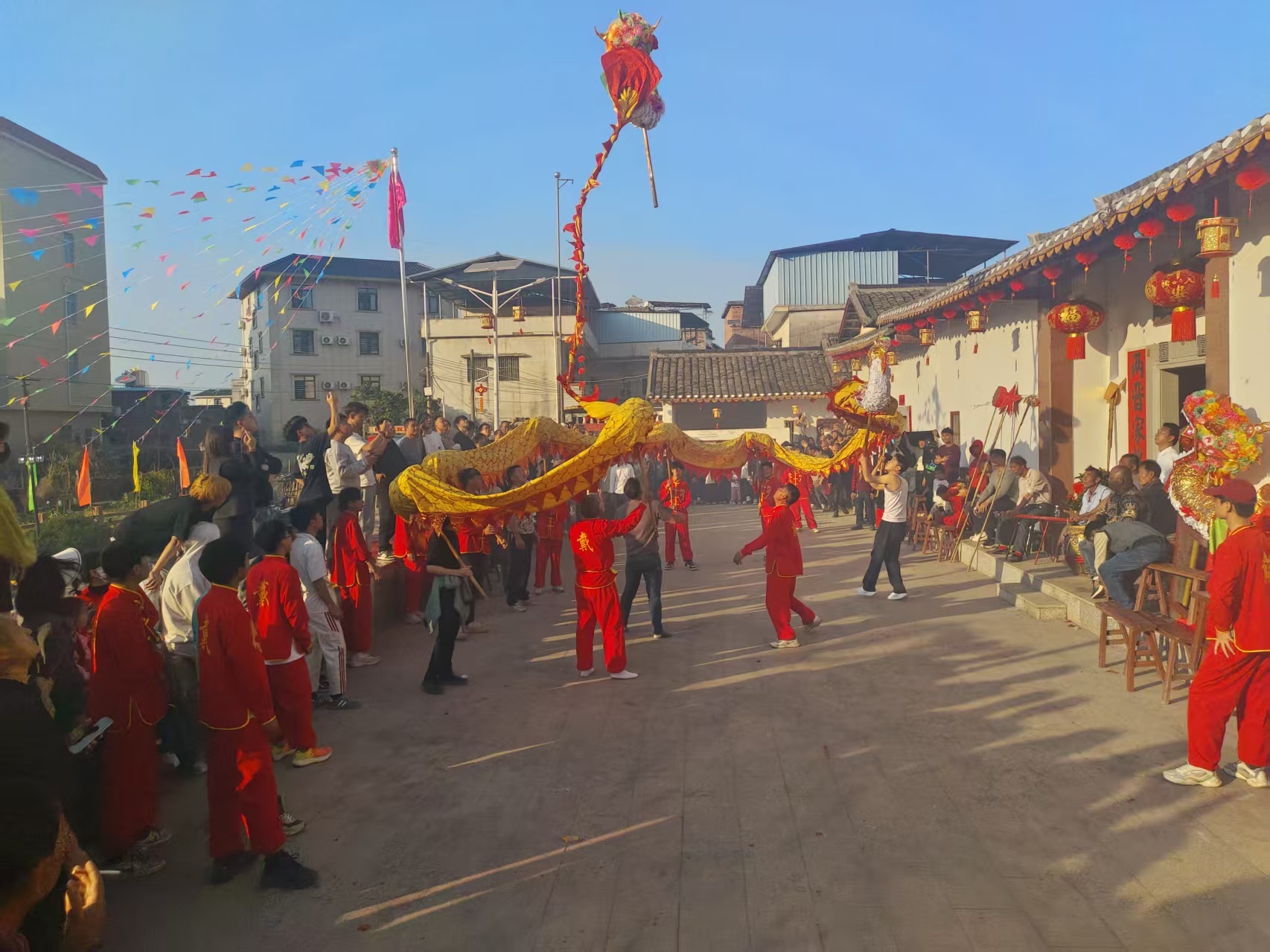 下午4时,汤二村下老屋禾坪上锣鼓喧天,人流如织。伴随着激昂的鼓点,一条锦色长龙在男儿们的挥舞下翻腾穿梭,时而昂首啸天,时而俯身探海,“舞龙跳凳”表演更是将力量与技巧完美结合,展现了客家男儿刚毅勇猛的精神风貌。霞光映照在祠堂上,金色的醒狮腾空跃起,鳞片闪闪发亮,鼓声响起,狮子轻跃而上,在高低错落的桩阵间游走,灵活的动作引得满堂喝彩,将现场气氛推向了高潮。精彩的龙狮表演不仅“唤醒”了村庄的年味,更拉开了当天民俗盛宴的序幕。